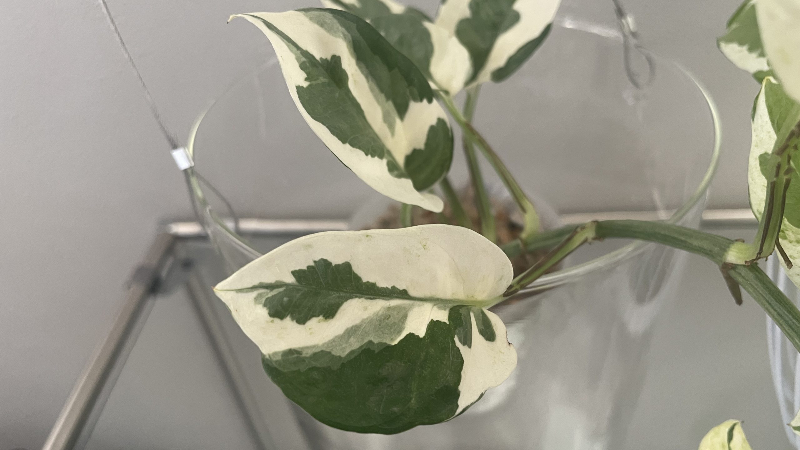 一般的なポトスに比べて葉がやや小ぶりで、白〜シルバーがかった斑がくっきり入るのが特徴。